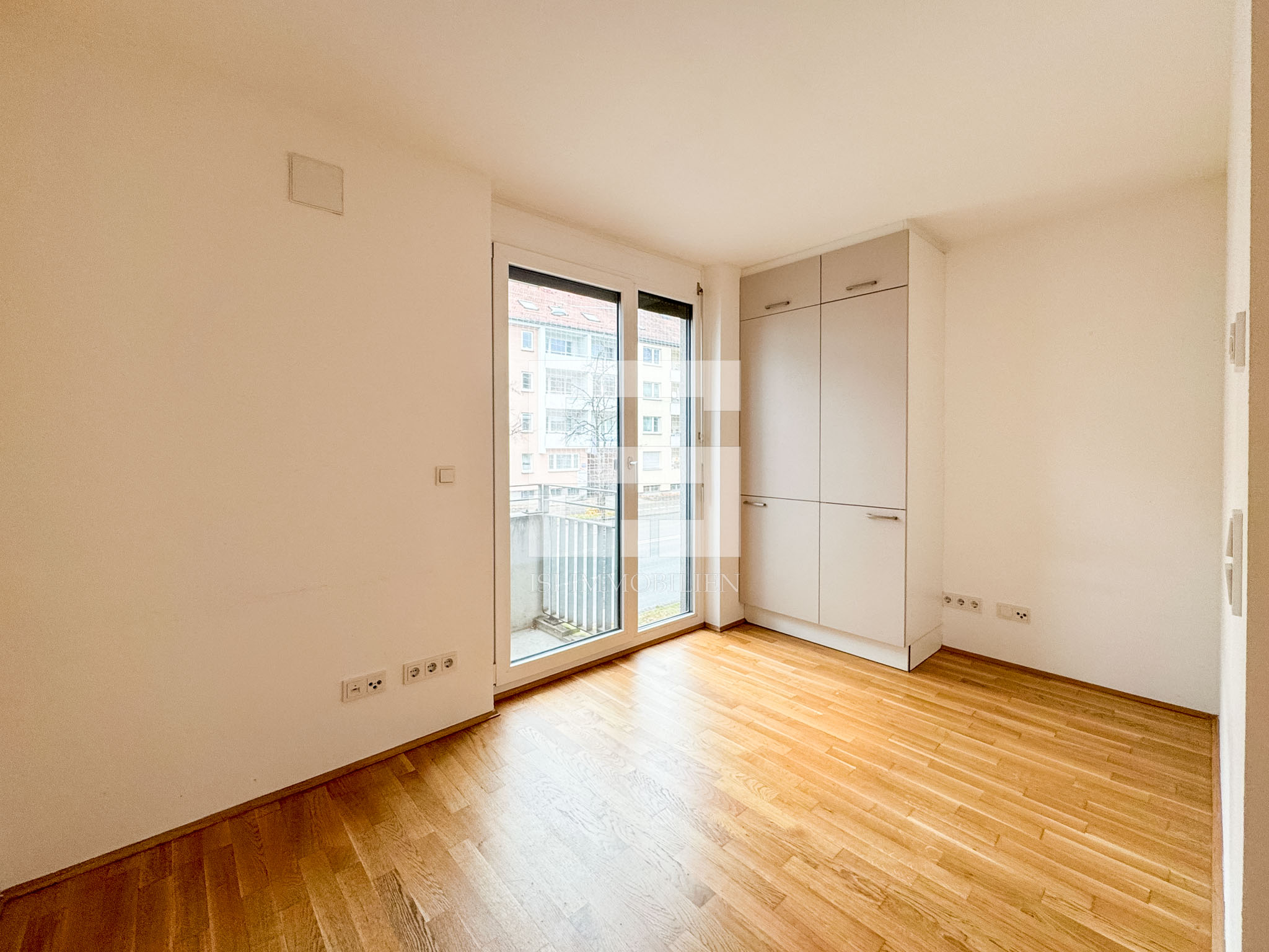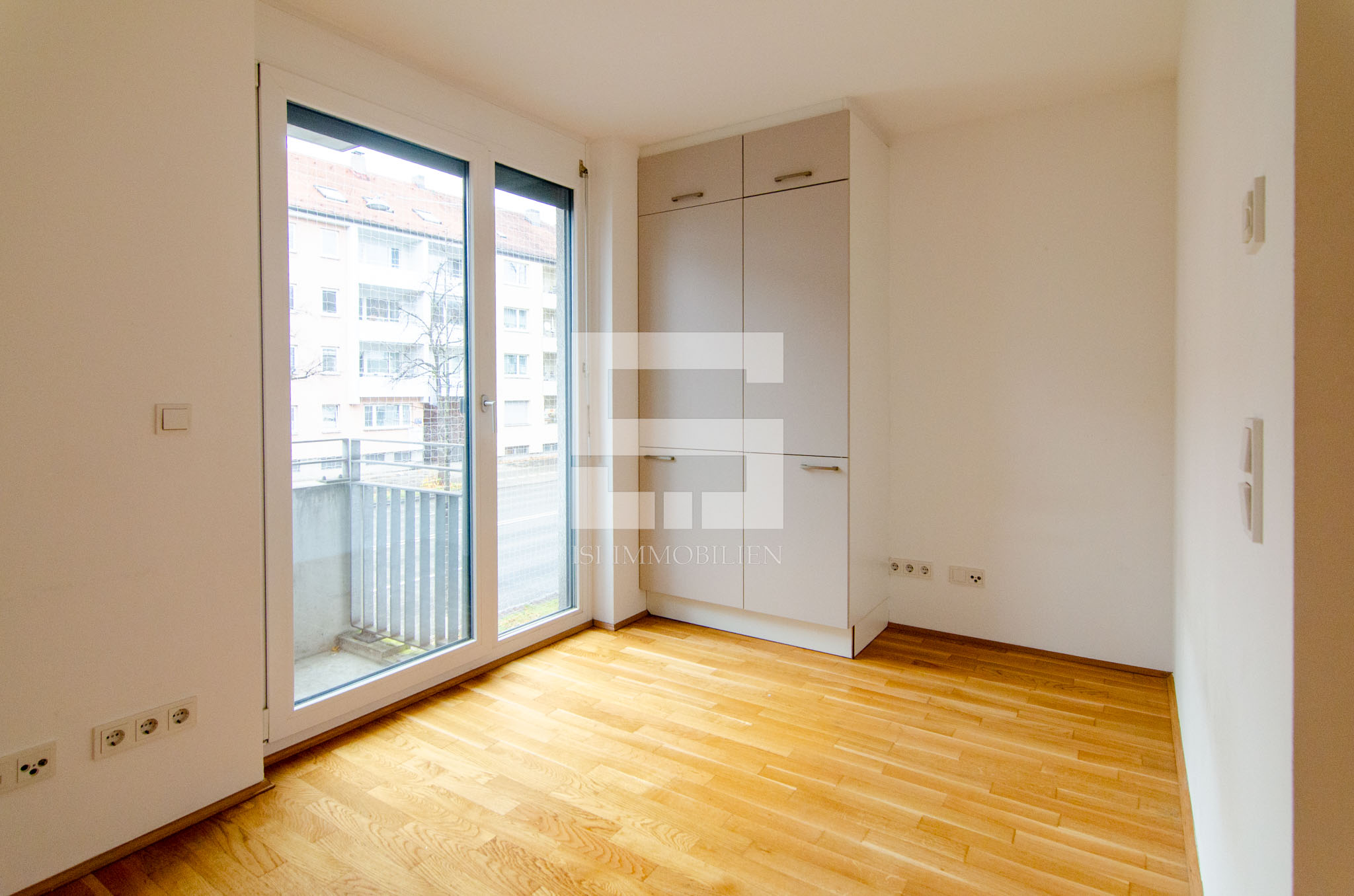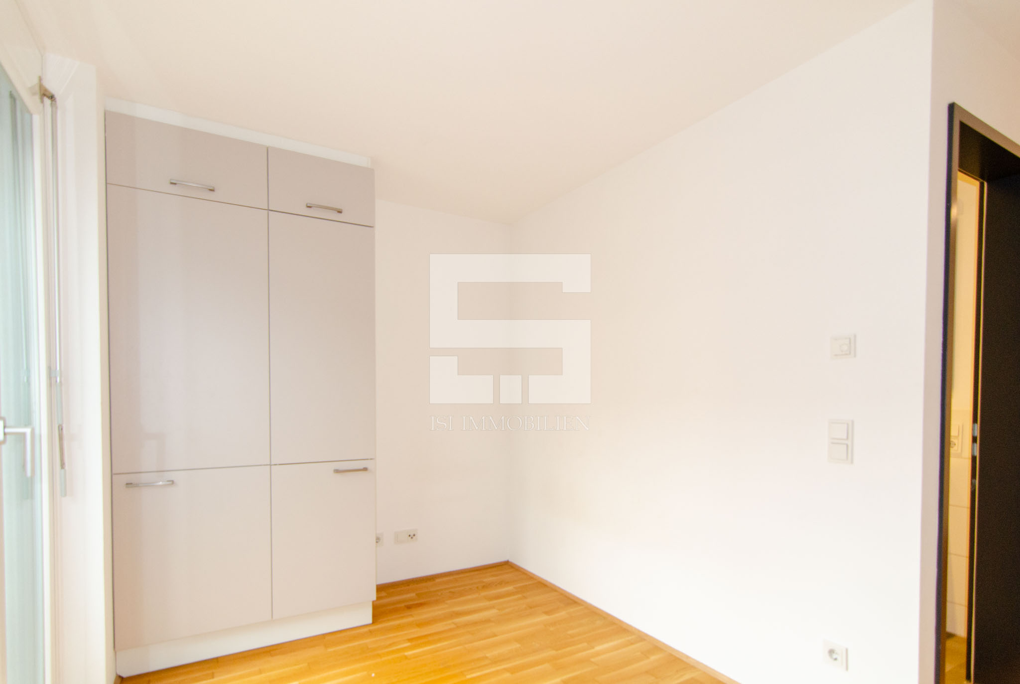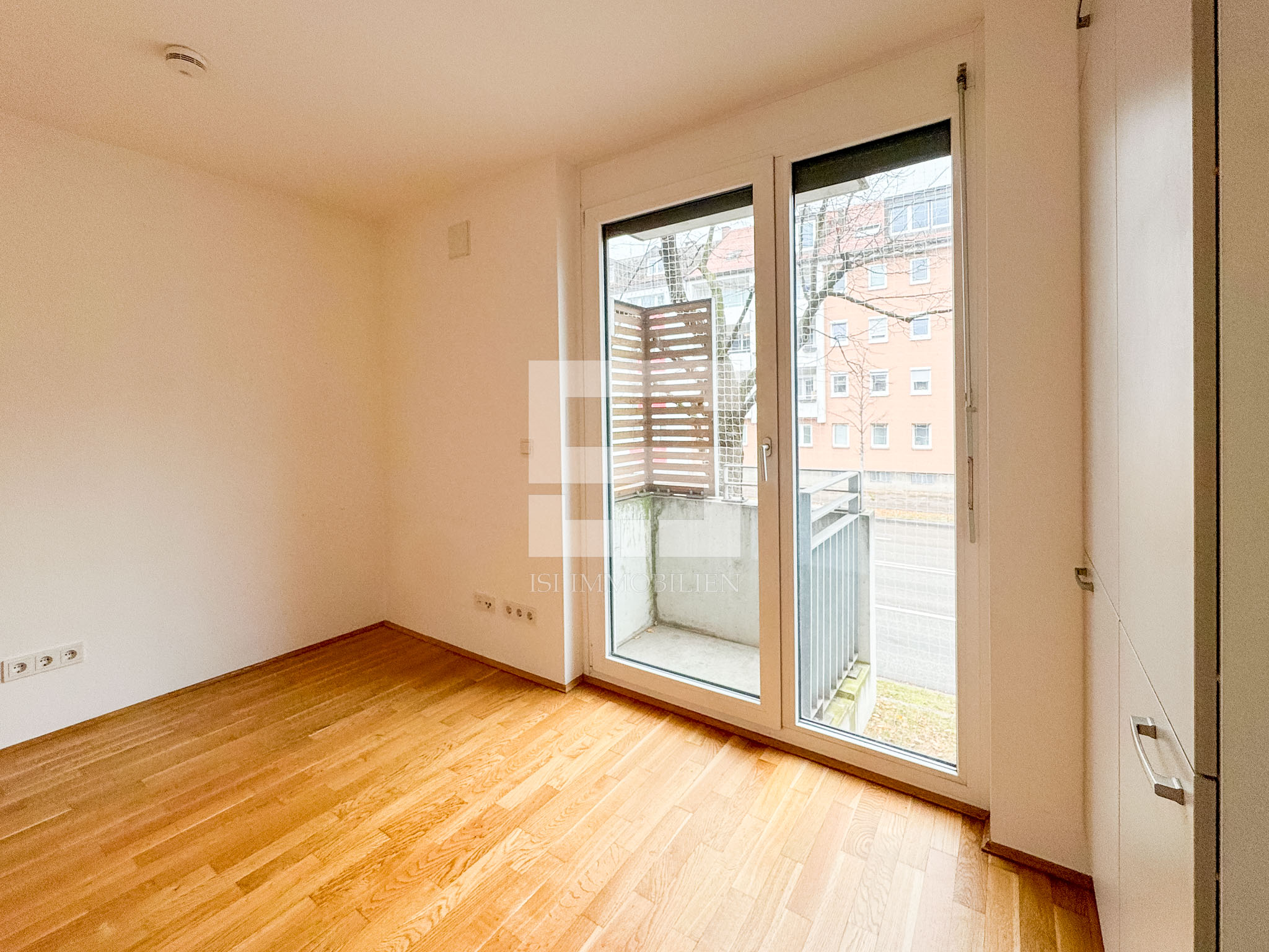 Der Wohn- und Schlafbereich ist offen gestaltet und bietet dank des warmen Holzfußbodens eine angenehme Wohnatmosphäre. Große Fenster sorgen für viel Tageslicht und schaffen ein freundliches Raumgefühl. Ein integrierter Einbauschrank bietet praktischen Stauraum und hilft, den Wohnraum optimal zu nutzen. Die Fußbodenheizung sorgt für angenehme Wärme.