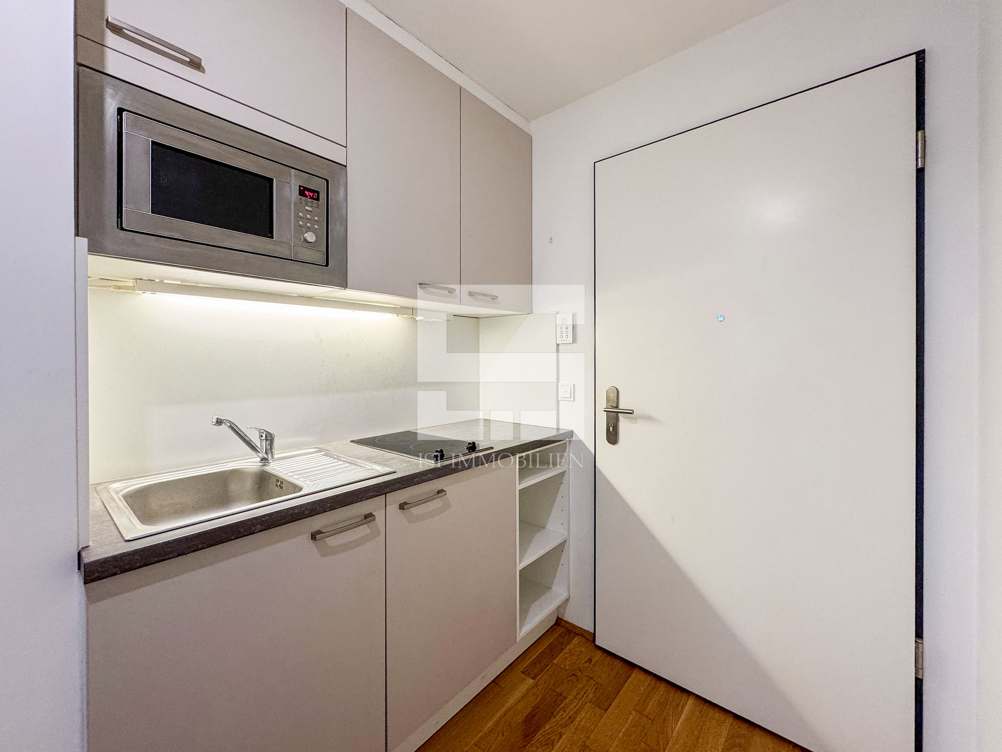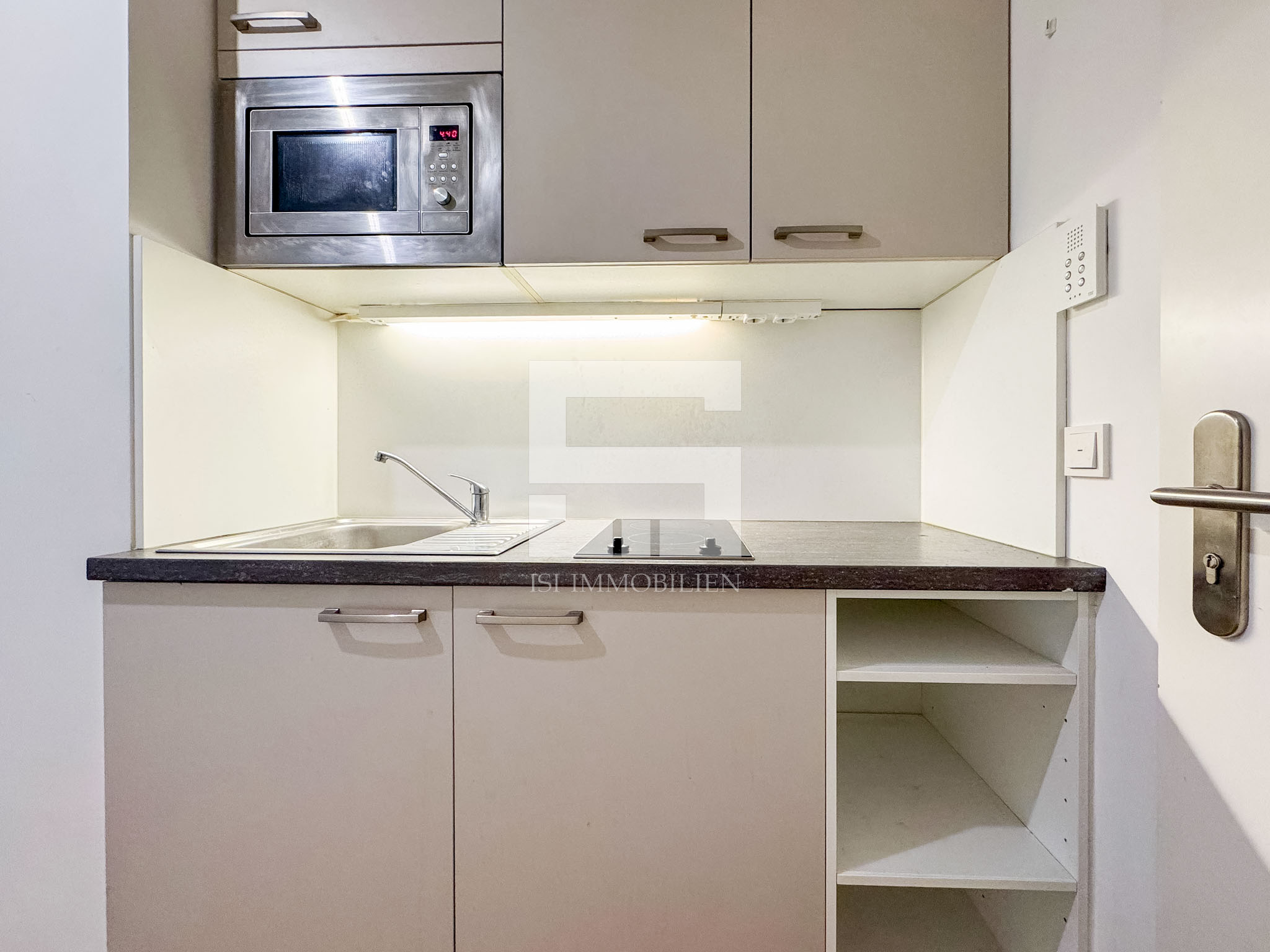 Die kompakte Küchenzeile ist platzsparend in den Eingangsbereich integriert und mit allem ausgestattet, was man für den täglichen Bedarf benötigt: Kochfeld, Spüle, Mikrowelle sowie Stauraum für Küchenutensilien. Perfekt für unkompliziertes Kochen im Alltag.