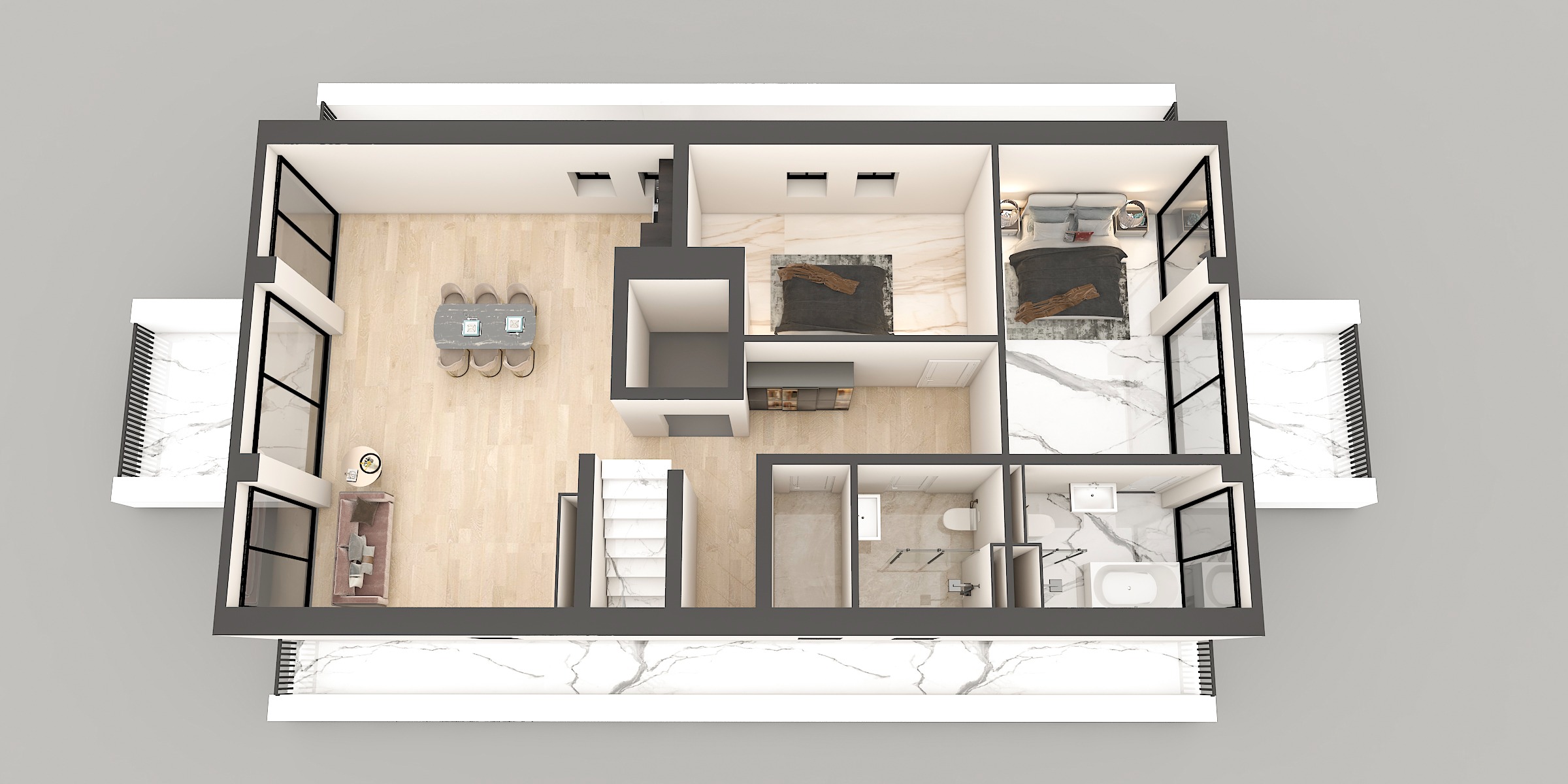 Das Wohnzimmer/Esszimmer mit ca. 41 m² und offener Küche steht für ein großzügiges Raumgefühl. Ein Schlafzimmer mit ca. 18 m² und ein Büro/Kinderzimmer mit ca. 15 m² sind ebenfalls großzügig bemessen. Das Masterbad, welches direkt vom Schlafzimmer begehbar ist, misst ca. 6 m². Die Fläche des kleinen Bades mit Gäste WC beträgt ca. 4 m². Eine eigenes Zimmer mit ca. 3 m² eignet sich für den begehbaren Kleiderschrank oder die Garderobe.