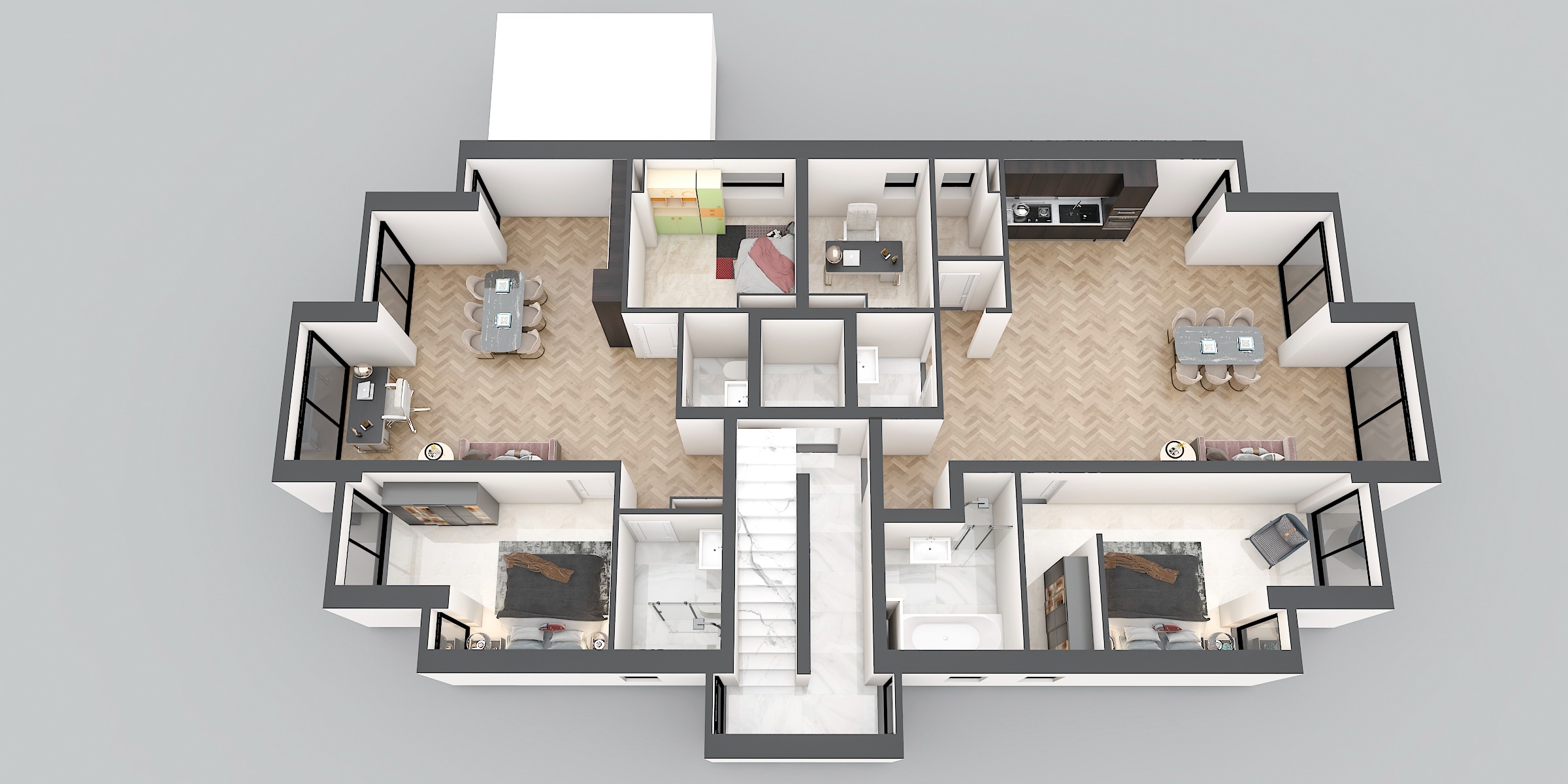 Eine Küche wird nicht gestellt. Diese kann der Mieter nach seinen Wünschen selbst planen und einbauen.