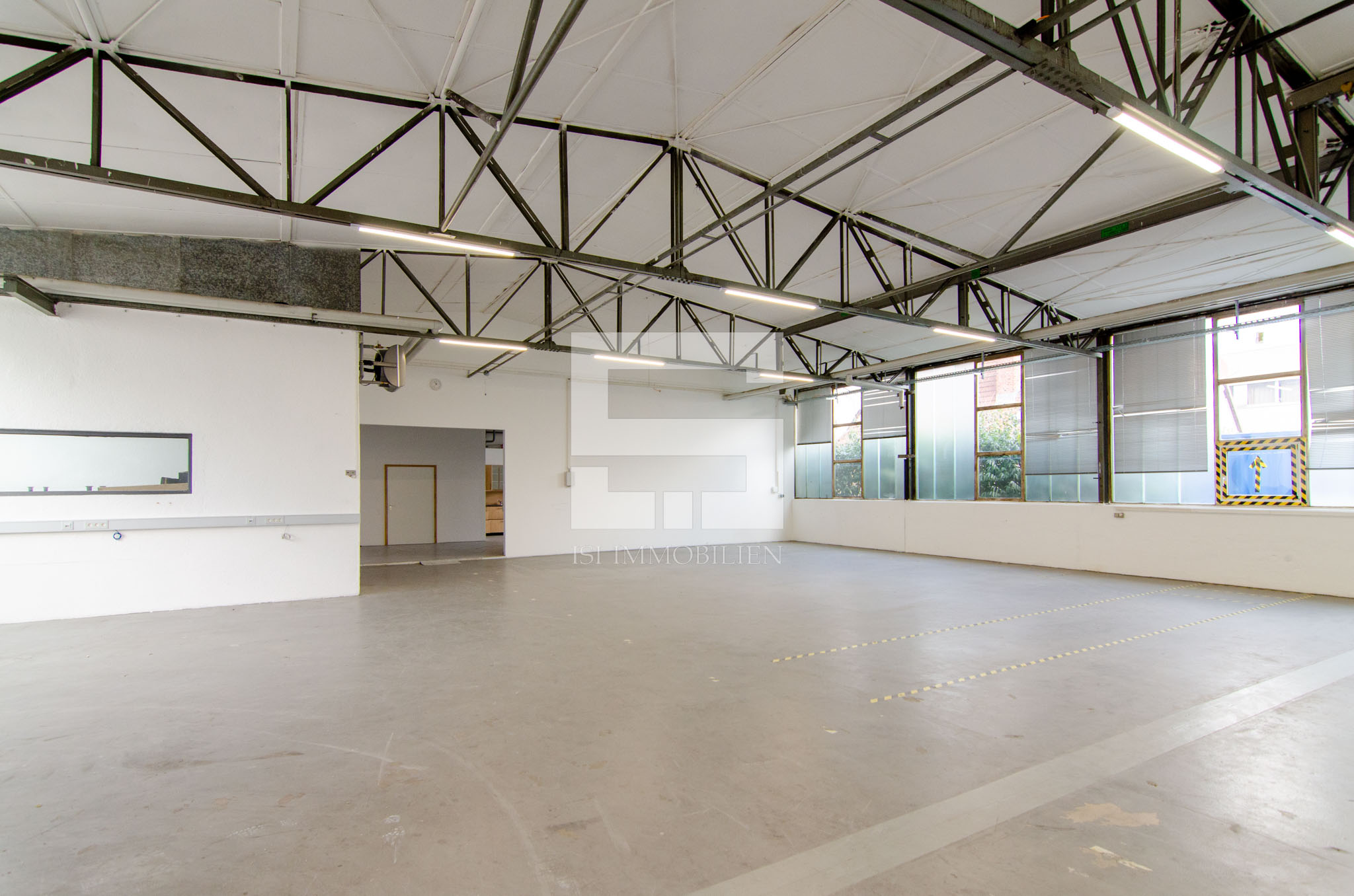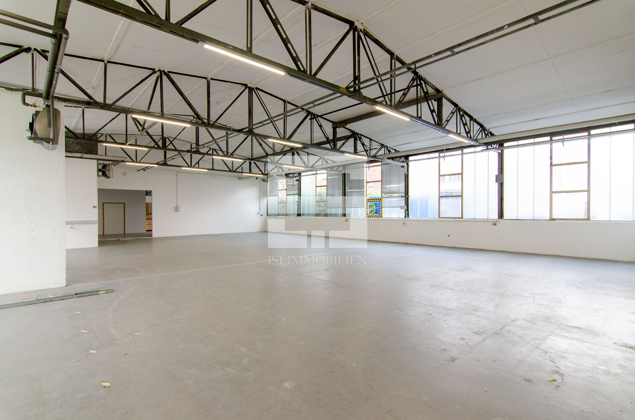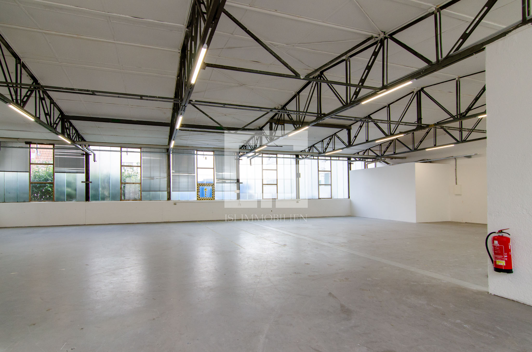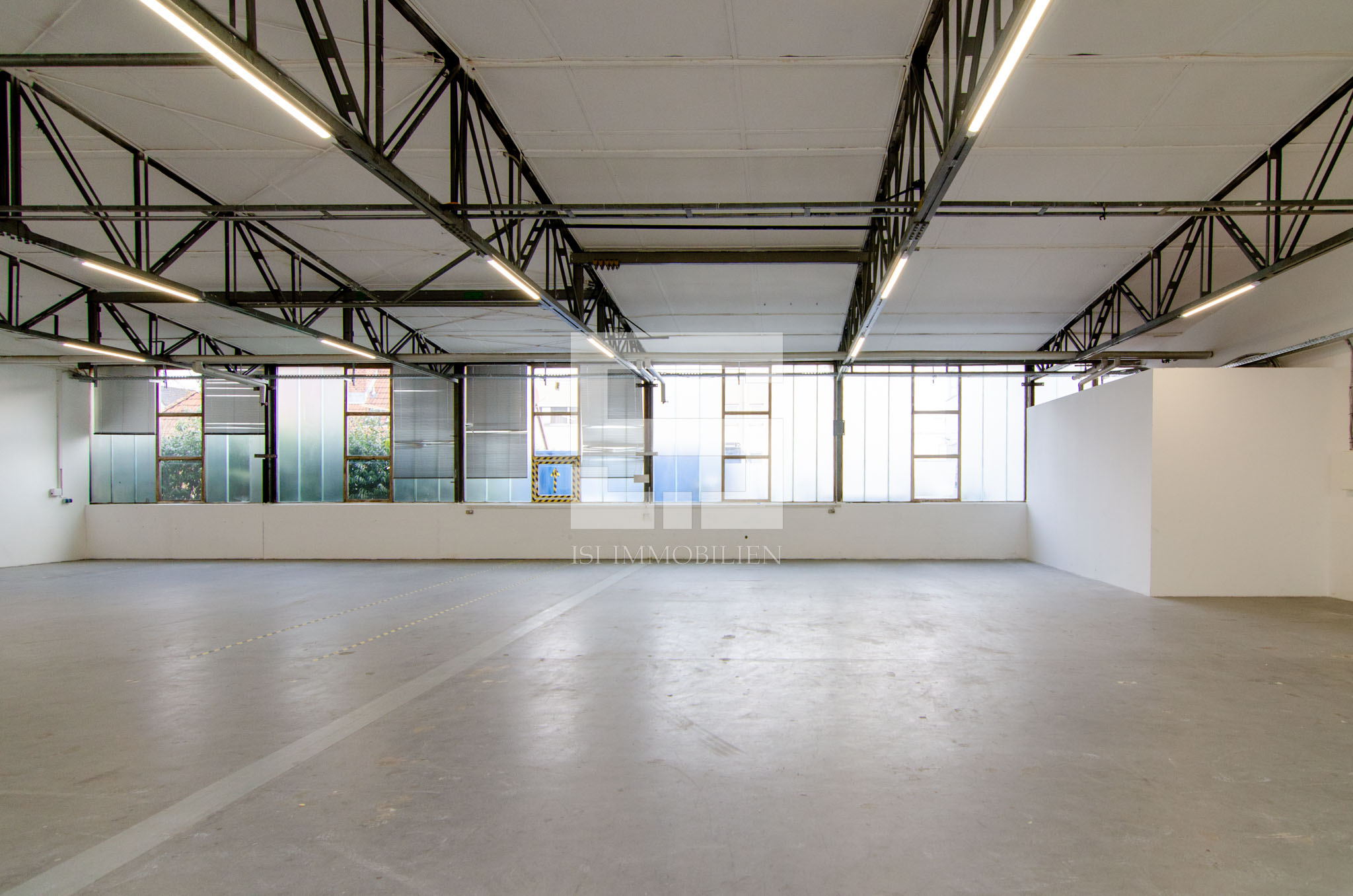 An den Decken-Trägern sind LED-Leuchten installiert. Durch die großen Fensterflächen bietet die Halle zudem viel Tageslicht